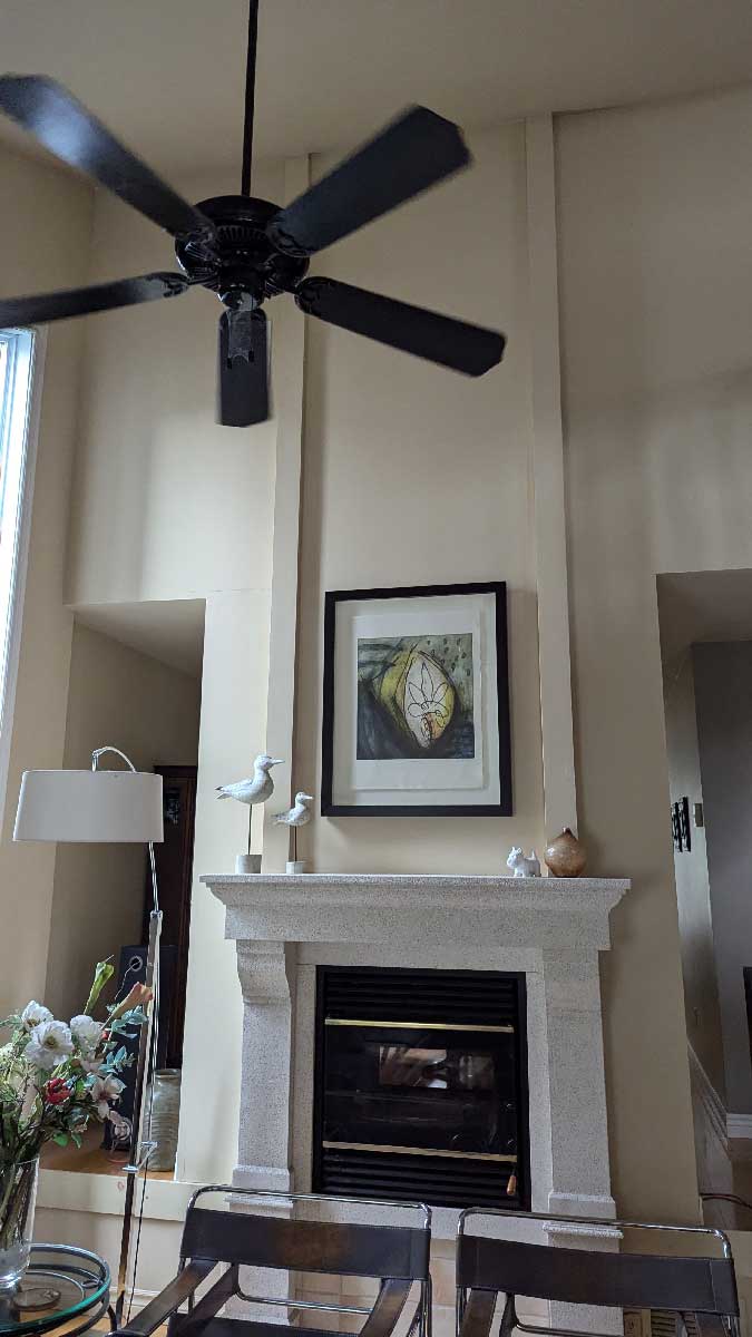 La nouvelle peinture des murs et du toit cathédral, ainsi que l’ajout d’un ventilateur de plafond et d’éclairage orientable, contribuent à transformer le lieu en un espace chaleureux et équilibré, adapté au quotidien.