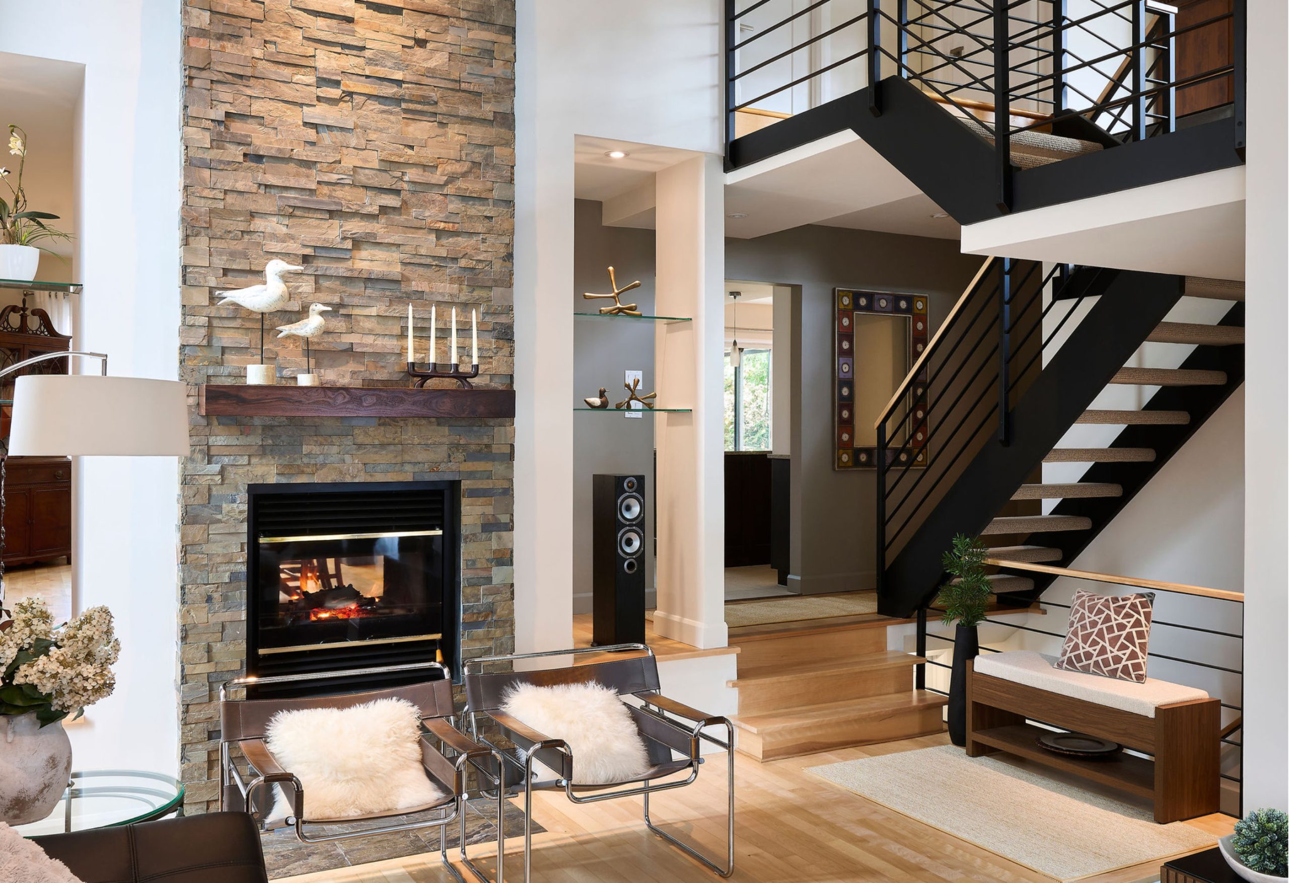 Le séjour a été repensé pour mieux valoriser ses volumes et sa chaleur. Le foyer en pierre Rustic, avec ses nuances de gris, d’or et de rouille, s’impose comme l’élément central de la pièce. Au sol, des carreaux d’ardoise reprennent ces mêmes tonalités dans une même continuité visuelle.
